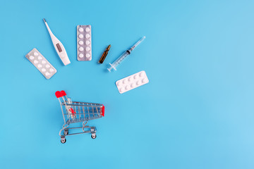 Shopping cart fell down with medical drugs, thermometer and syringe scattered on blue background.