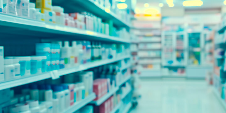 Blurred background of a pharmacy store. Pharmacist and medicine concept
