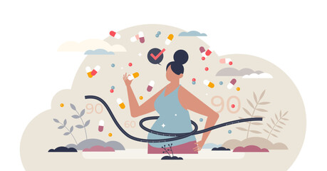Weight loss pills and unhealthy dieting with medication tiny person concept, transparent background. Dietary drug intake as waistline control therapy with pharmacy illustration. Obesity and obsession.