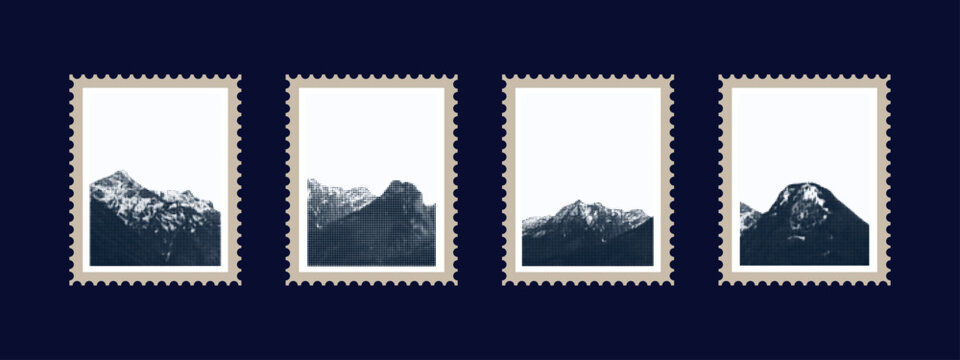 Mountain postage stamp. Contemporary art, philatelic culture, and the environment. A collection of paper mountain and rocky slopes. Peaks with a grunge texture, old postage stamps. Vector illustration