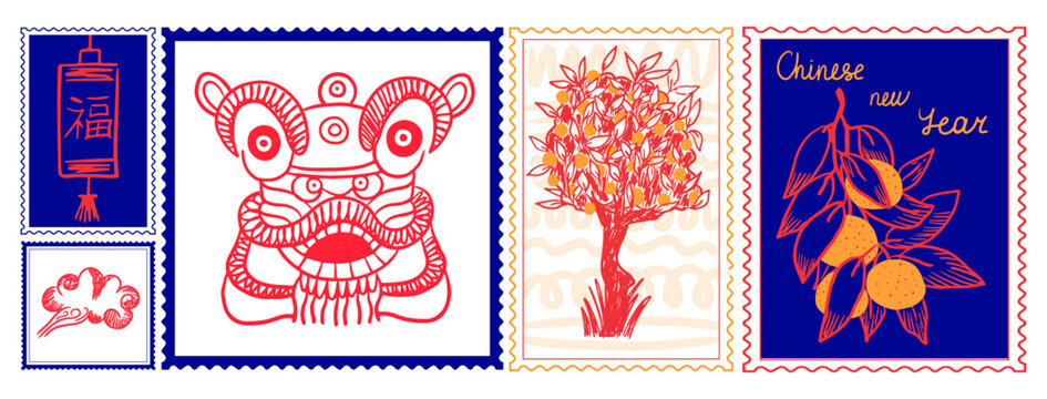 Collection of vintage Chinese New Year postage stamps. Hand-Drawn traditional symbols, lion dance mask and red lanterns, kumquat tree  and tangerines. Decorative Lunar New Year philatelic set