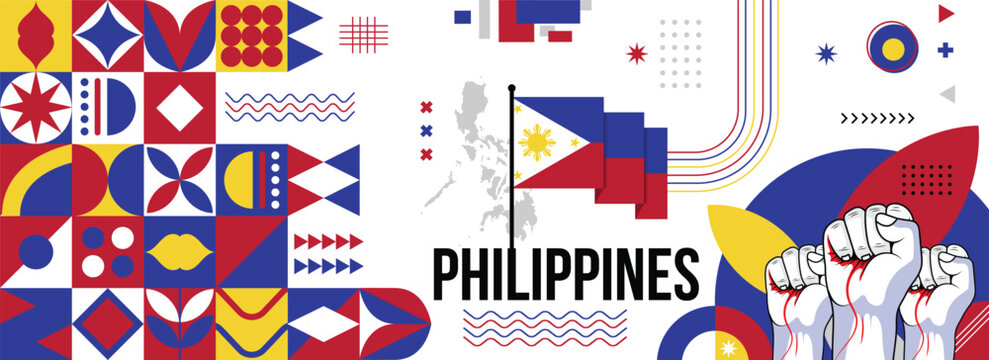 Philippines national or independence day banner for country celebration. Flag and map of Filipino with raised fists. Modern retro design with typorgaphy abstract geometric icons. Vector illustration
