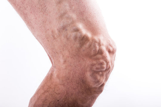 human leg with blocked veins, thrombosis, phlebitis, and standing on a white background, with depth of field Photo