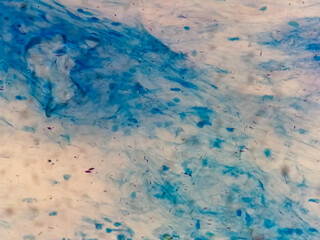Coughing up mucus and phlegm from a chest infection from a virus and bacteria infection, looking at it under the microscope, with cells and microorganisms. Bacteria and skin cells close up