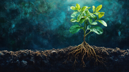 Tree roots visible in soil, extending from bottom to top, brown in color with white lines connecting. Soil and tree set against gray background, drawing focus to intricate details.