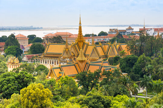 Top view of Phnom Penh's Royal Palace complex, with golden spires glistening under the bright blue sky and riverbank views.