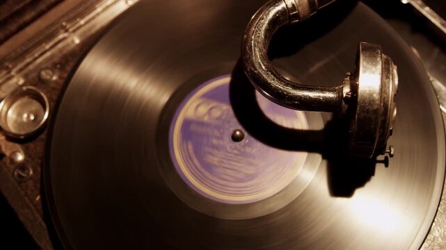 This video shows a close up view of an antique phonograph playing in moody lighting.