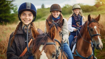 A group of young girls riding horses on a sunny day, adorned in their riding gear with cheerful smiles, enjoying the fun and adventure of an outdoor equestrian activity.