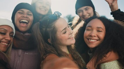 Selfie, group of happy friends and camping adventure, hugging together with diversity and friendship. Smile on face, photography and women on nature camp to relax, laugh and outdoor winter vacation.