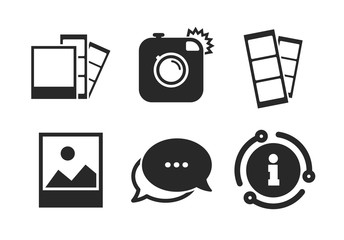 Flash light symbol. Chat, info sign. Hipster photo camera icon. Photo booth strips sign. Landscape photo frame. Classic style speech bubble icon. Vector