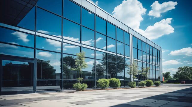 Close up outside photo of glass wall of commercial office building from outside on bright sunny day