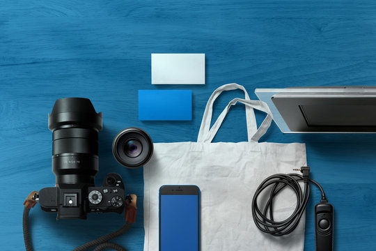 Creative business card mock up on a flat lay background with cameras and copy space for personalized branding design