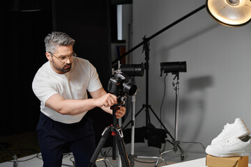 Creative professional capturing stylish footwear in a studio setting
