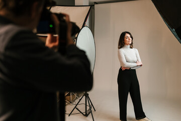 Smiling woman crossing hands during photo session