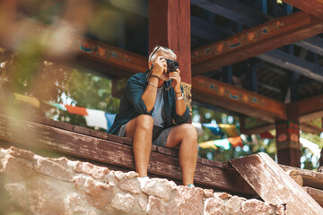 An old man traveler with a camera in his hands sits and takes pictures.