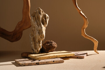 Abstract background for product presentation made with glass panel on a beige backdrop.