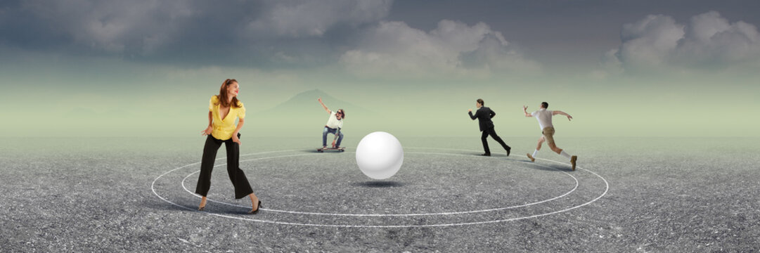 Different types of men running for woman to get her attention. Choosing partner for life. Relationship. Contemporary art collage. Concept of surrealism, futurism, creativity, imagination, fantasy, ad