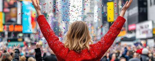 A celebratory scene in Times Square with a woman in a red outfit, surrounded by confetti and a large crowd, embodying joy and excitement.