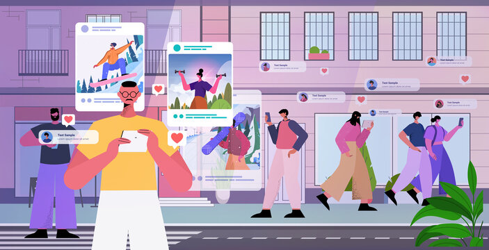 addicted people bloggers sharing photos at social networks men women making posts for followers social media addiction
