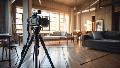 Group of three young people enthusiastically analyzing camera setup in a well-lit room while discussing project details and sharing ideas together