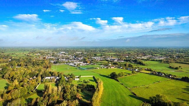 Village of Portumna in Ireland - a stunning aerial view showcasing lush green fields along with a small picturesque town