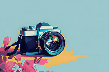 Vibrant camera illustration with floral accents, ideal for photography enthusiasts. Perfect for marketing, social media, and artistic projects, featuring ample copy space.