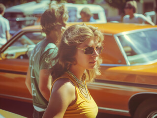 Young woman with sunglasses and necklaces posing next to a vintage orange car at a 1970s car show, with a blurred crowd and other vehicles in the background