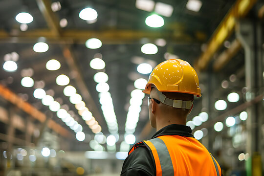 Industrial Worker in Hard Hat Dealing with Glare from Unpolished Overhead Lights in Factory Setting