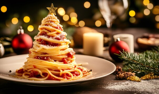 Spaghetti pasta shaped as a christmas tree creating a unique holiday meal centerpiece