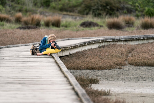 Camera, photographer and elderly woman taking pictures while hiking in a forest, calm and content. Nature, photography and senior lady enjoying retirement, relax and hobby while on vacation outdoors
