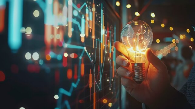 Illuminating Insights, Businessman Holds Creative Light Bulb Alongside Growth Graph and Analytics Icons.