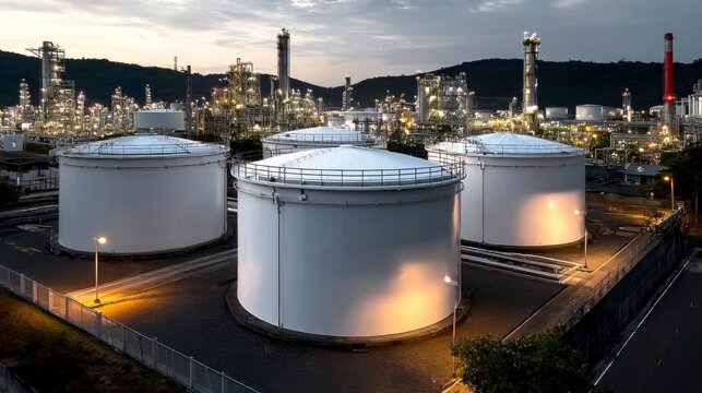 Industrial oil storage tanks refined energy facility infrastructure photography urban environment aerial perspective sustainability insights
