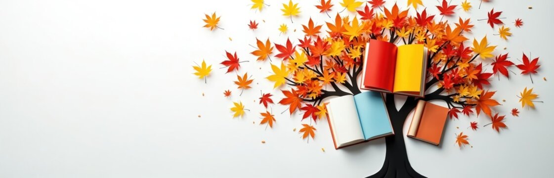 Creative art tree made from open books and fall leaves. Colorful autumn concept photo with red orange yellow leaves and books. Educational season theme.