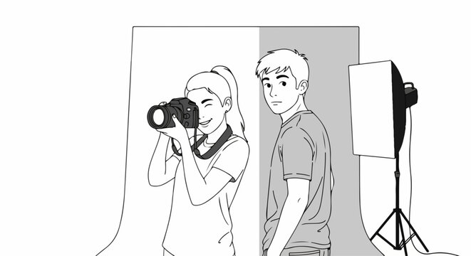 Photographer at work, capturing model in photo studio with backdrop and softbox. Photographer in action is fully engaged to take perfect photo of his handsome male model in photo studio.