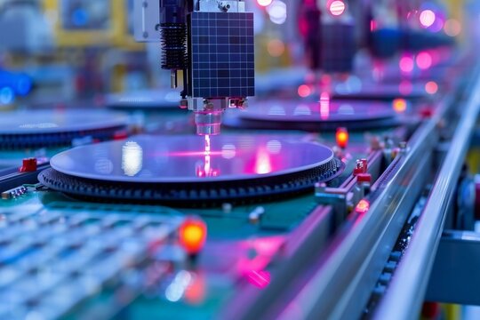 A detailed view of semiconductor fabrication, showing a precision machine working on a microchip in a high-tech manufacturing facility.