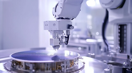 A robotic arm in a semiconductor cleanroom, placing silicon wafers into a photolithography machine, sterile white environment