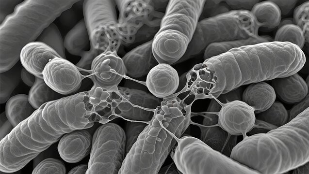 High-resolution scanning electron micrograph revealing intricate bacterial colonies and their detailed cellular structures, showcasing microscopic life and microbial interactions