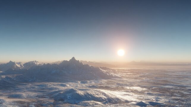 Cinematic photorealistic sunrise on pluto  icy plains and jagged mountains in an alien atmosphere