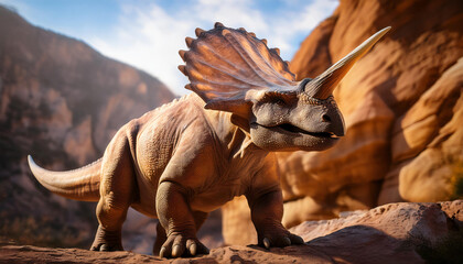 A photorealistic rendering of a Triceratops defending its territory in a rocky canyon. The Triceratops displays its impressive frill and horns, with detailed rock textures and a rugged terrain in the