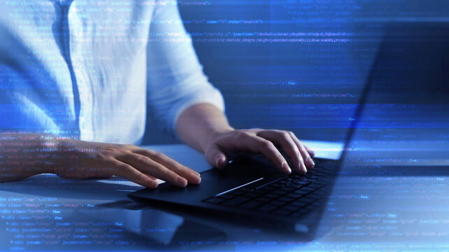 Professional woman working on laptop for learning at work week