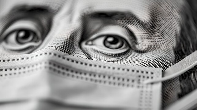 Close-up of a monochrome portrait on currency with a face mask. Conceptual financial health image. Illustration of economic impact of pandemics. Creative and impactful design. AI