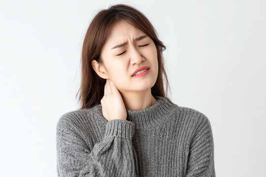Young woman in a gray sweater grimaces in pain while holding her neck, indicating discomfort or stiffness against a plain white background