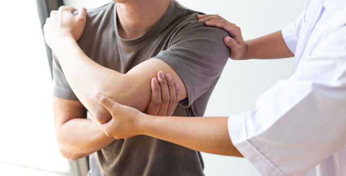 Doctor physiotherapist assisting a male patient while giving exercising treatment massaging the shoulder of patient in a physio room, rehabilitation physiotherapy concept