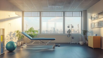 Vacant rehabilitation room with diverse equipment in physiotherapy clinic or rehab center, ideal for physical therapy, recovery exercises, and sports medicine treatments