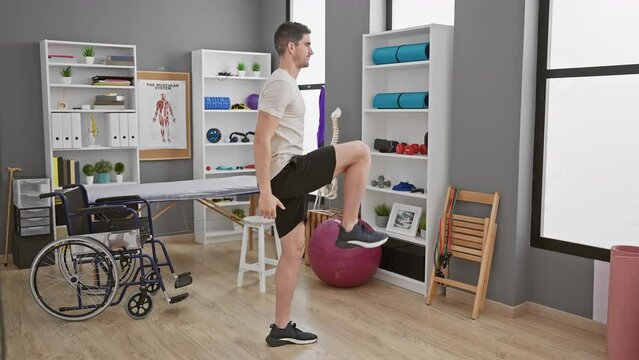 Hispanic man performing rehabilitation exercises in a modern physiotherapy clinic.