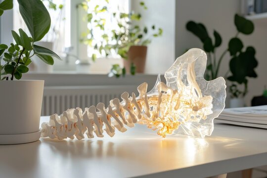 Cervical spine intervertebral hernia with fibrous ring rupture, accompanied by osteochondrosis, as depicted in a human spinal column plastic model at a physiotherapy clinic