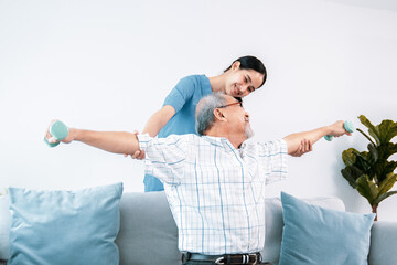 Contented senior patient doing physical therapy with the help of his caregiver. Senior physical therapy, physiotherapy treatment, nursing home for the elderly