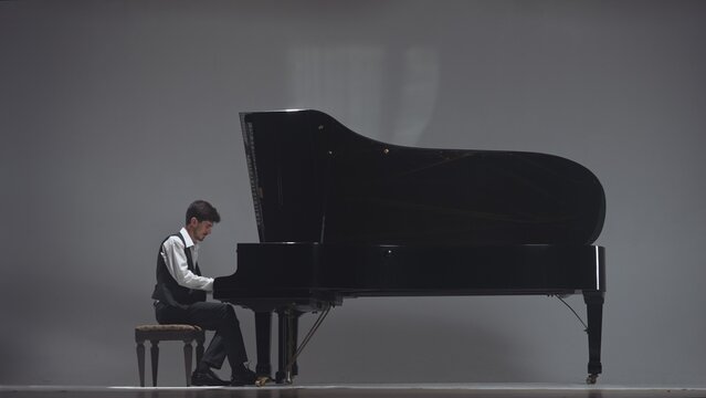 Pianist bathed in stage light plays melody, blends seamlessly with vibrant colors surrounding her, creating surreal musical experience. Concept of classical and modern music, entertainment, jazz. Ad