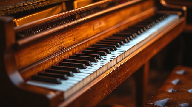 A polished black grand piano takes center stage in a softly lit interior. The keys gleam, suggesting a moment of musical inspiration. An elegant instrument ready to create.