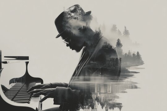 Minimalist double exposure of a musician with piano keys and sound waves merging, artistic music theme